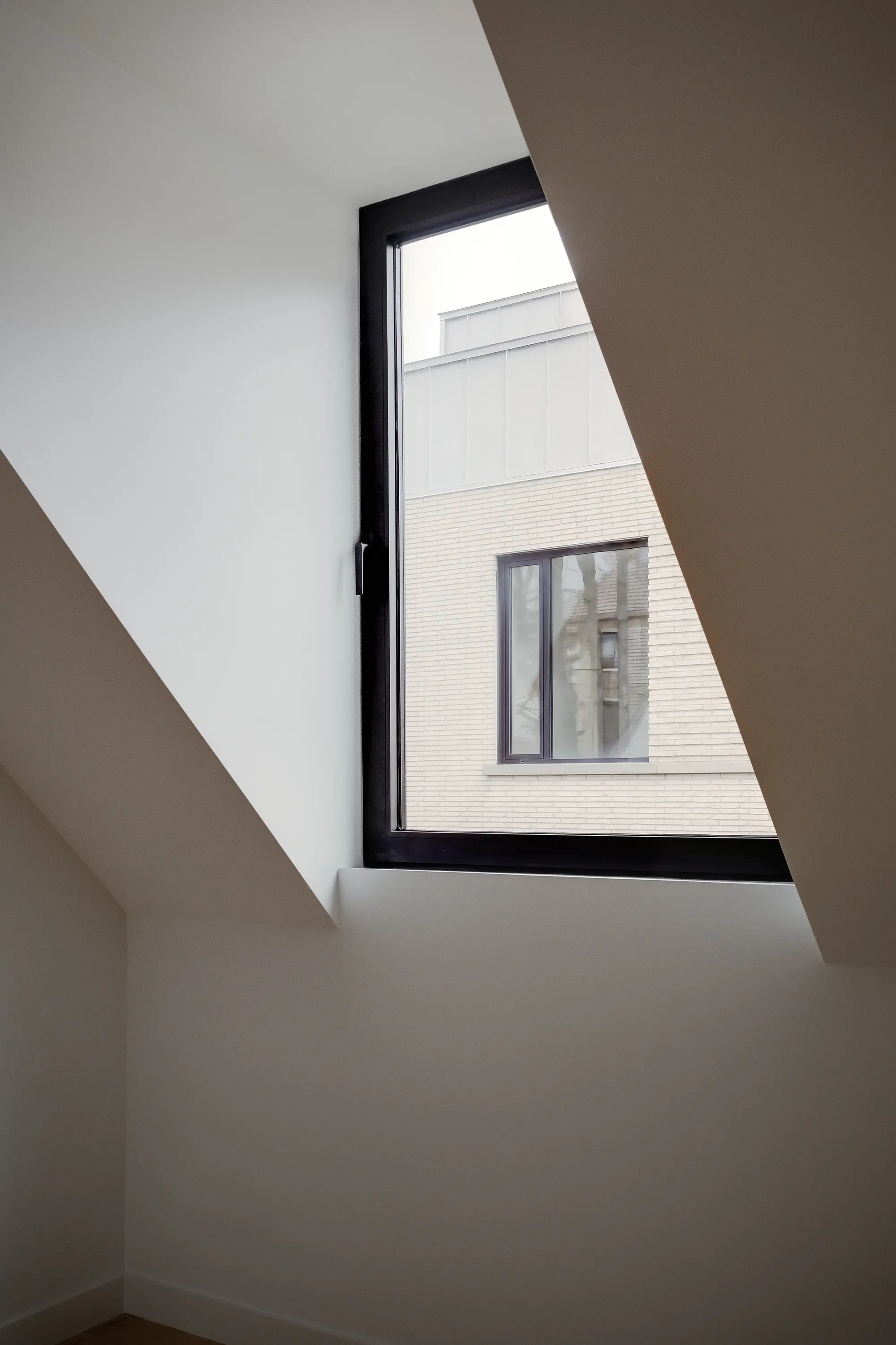 Belgian buff brick wraps the primary elevations, creating material continuity and a sense of permanence. Window openings are carefully proportioned and detailed with limestone sills, while patterned brickwork between the main openings introduces depth and shadow across the façades. Entrances are clearly defined yet restrained, reinforcing a calm residential presence along the street.