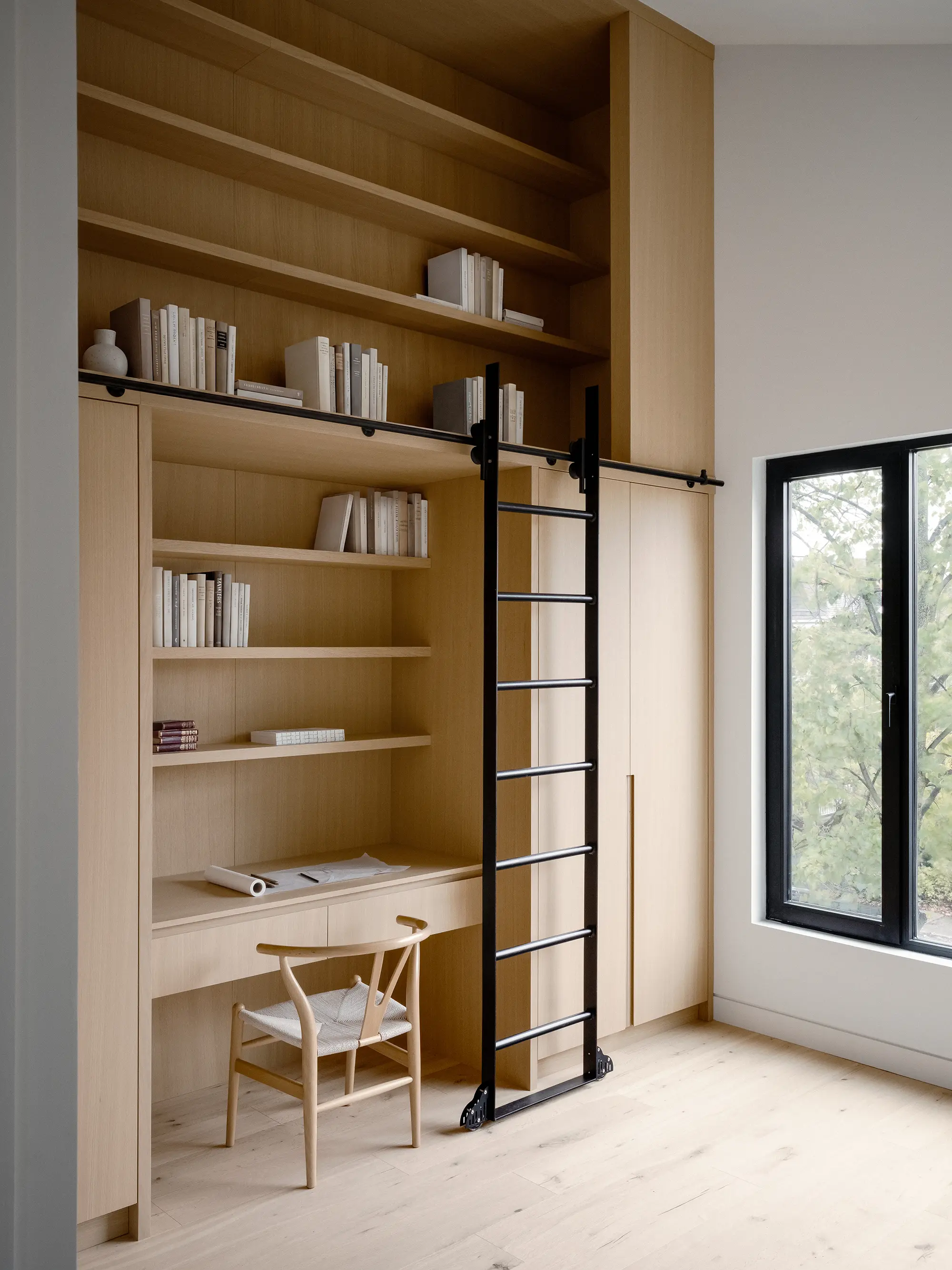The interior spaces, designed in collaboration with Unison Group, are defined by a reductive and warm material palette of light oak flooring and full-height millwork. Large floor-to-ceiling sliding doors dissolve the boundary between living spaces and outdoor terraces, bringing natural light deep into the open-plan interiors. A central staircase enclosed with glass balustrades anchors the plan and enhances visual continuity between levels. On the second floor, the full volume of the gabled roof is used to create a double-height library. This contemplative space incorporates a custom built-in desk and upper shelving accessed by a rolling ladder, transforming the building’s profile into a distinct spatial experience.