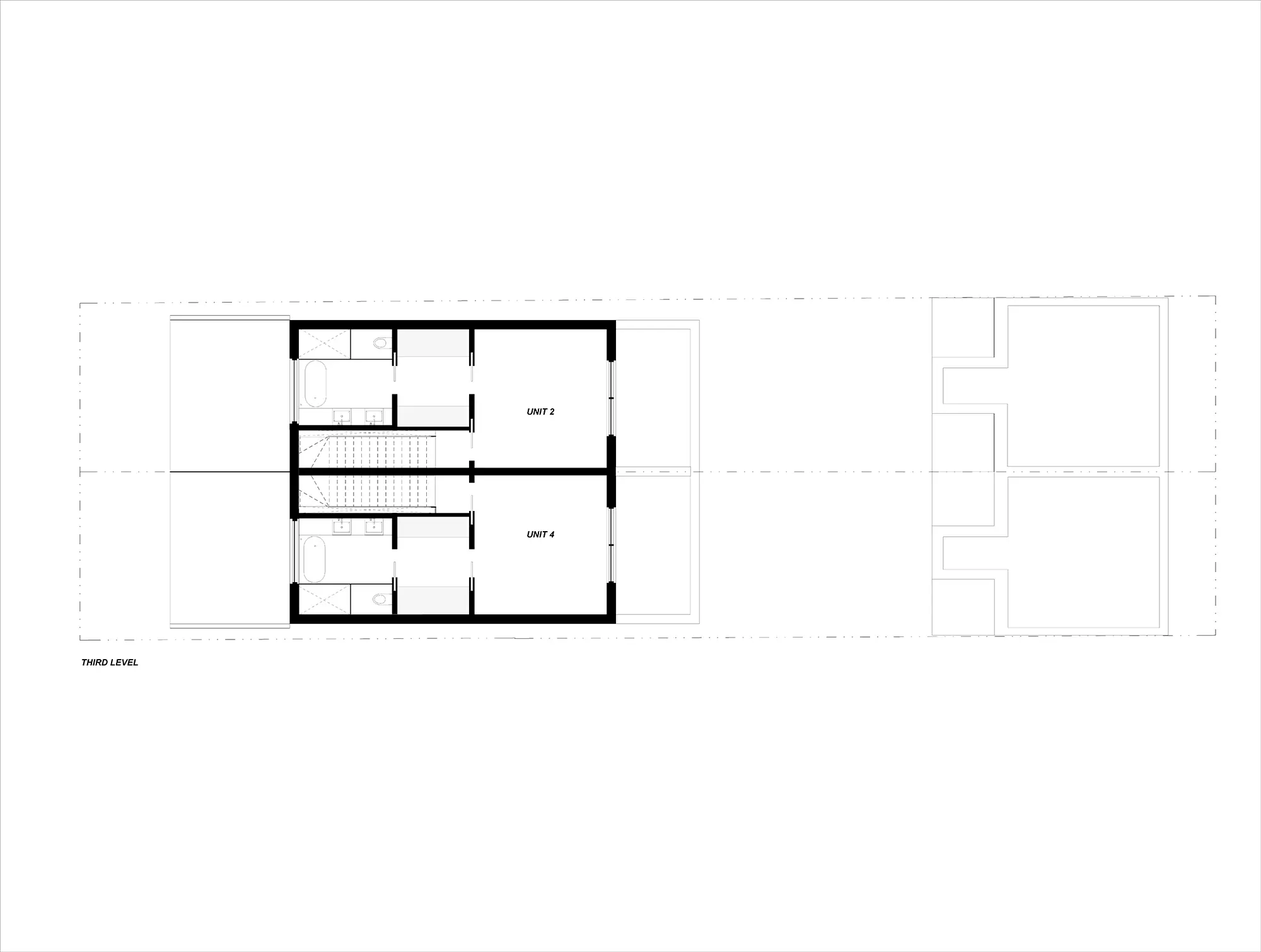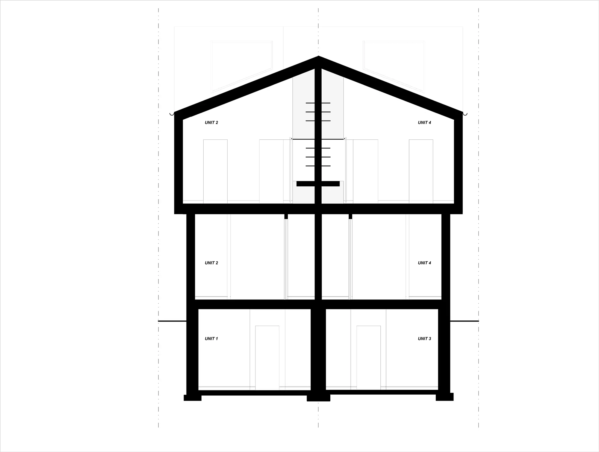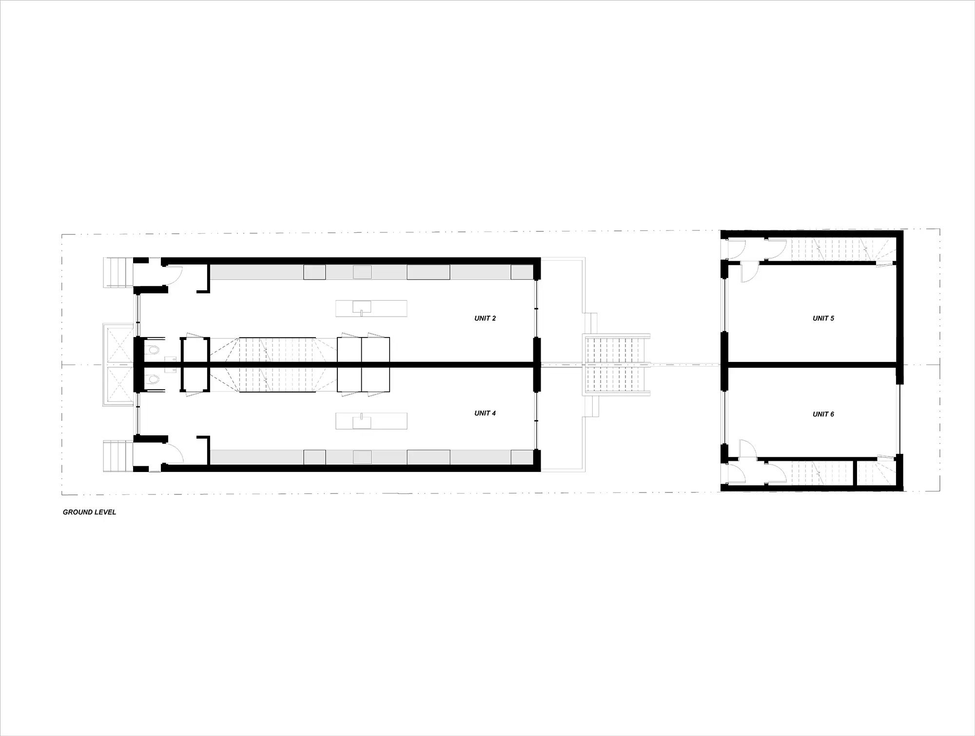 At the rear of the site, the laneway houses complete the composition. Though smaller in scale, their massing and proportions closely align with those of the street-facing buildings, allowing the project to read as a unified architectural ensemble. Their orientation toward the laneway reimagines it as a shared front-yard condition connected to the park, rather than as a residual service space shaped primarily by vehicles.
