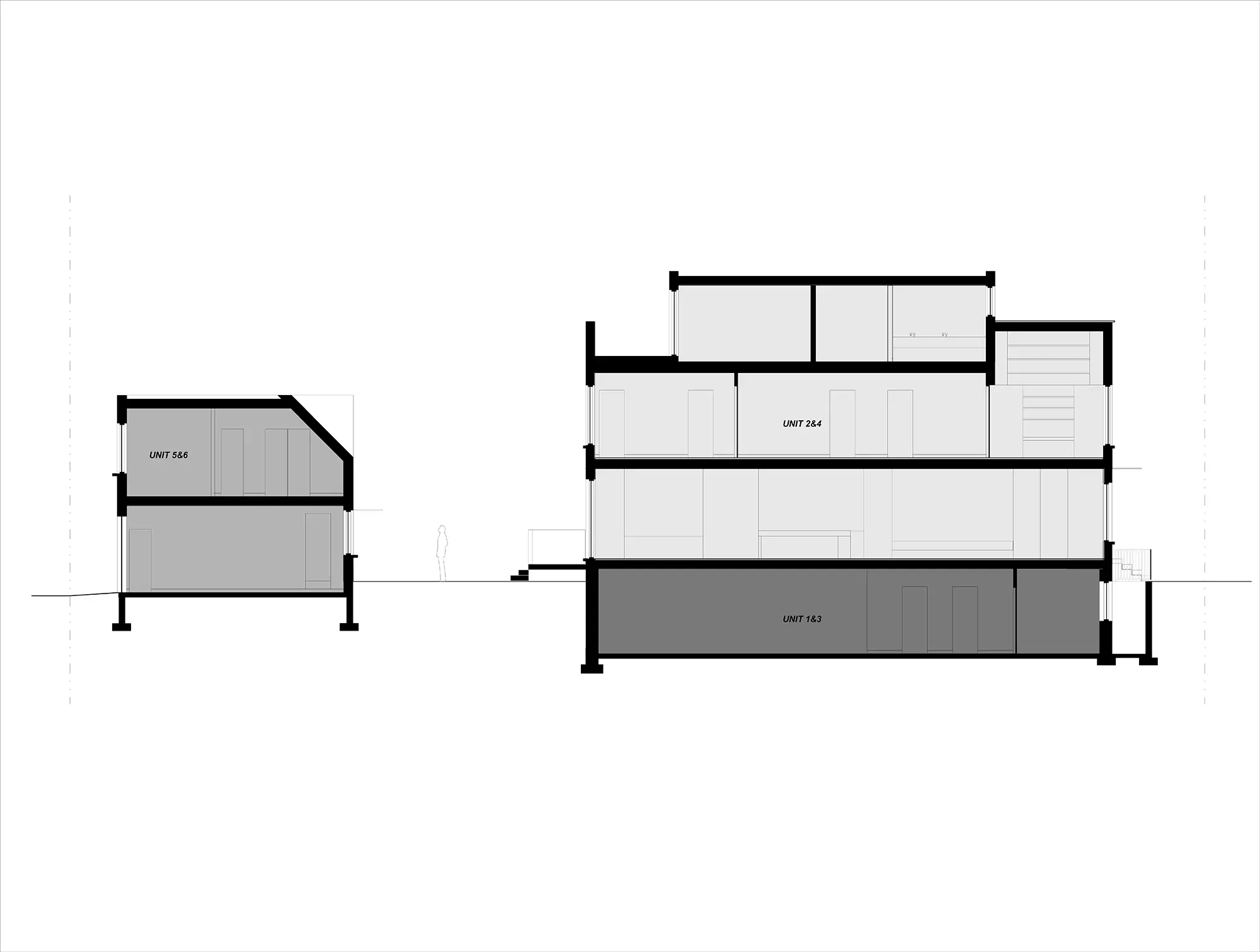 Located in a low-rise residential neighbourhood in Toronto, this six-unit rental housing project spans two lots and explores the architectural potential of incremental density through a carefully composed group of buildings. The development consists of two semi-detached multiplexes facing the street and two semi-detached laneway houses at the rear of the site, oriented towards Bickford Park.