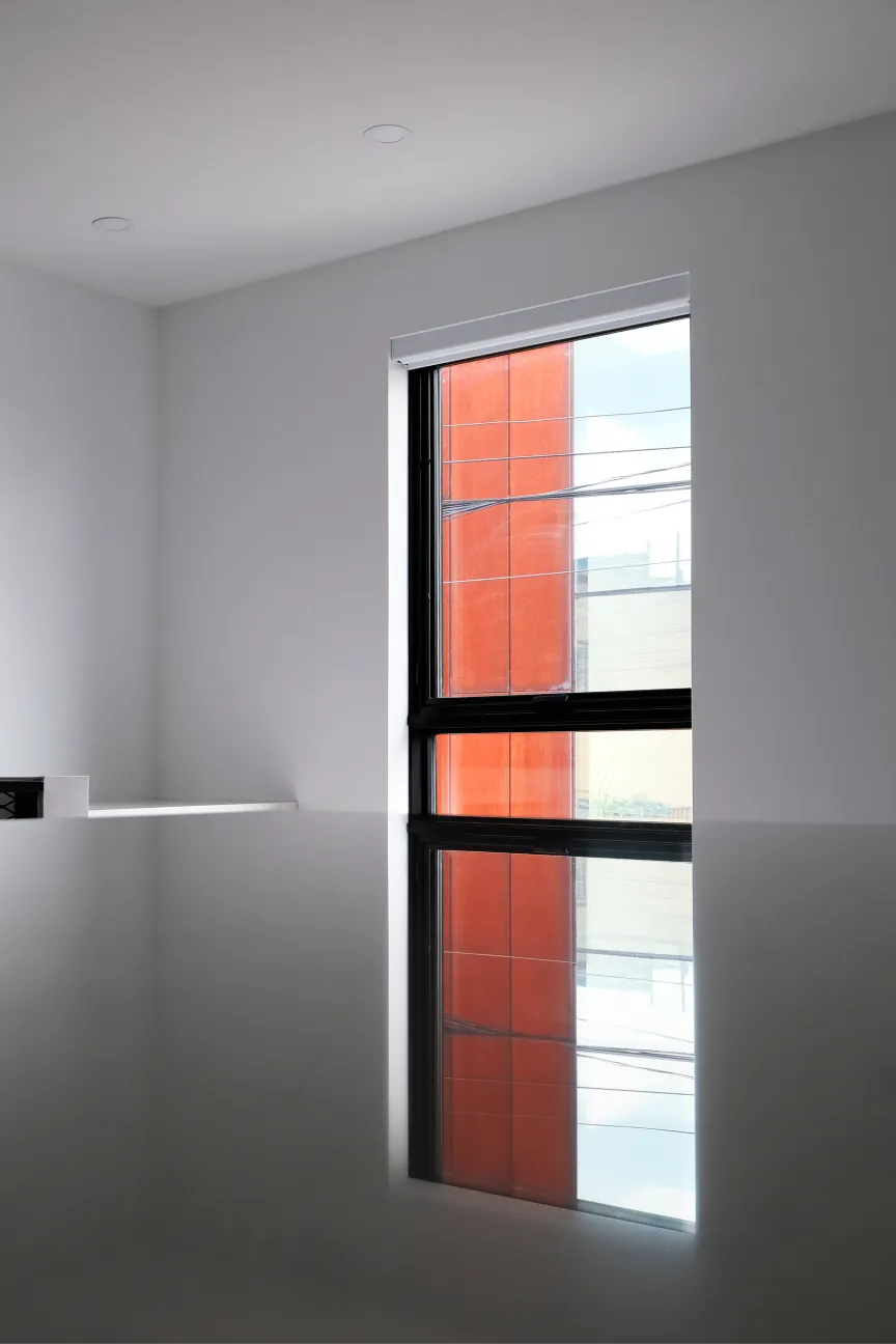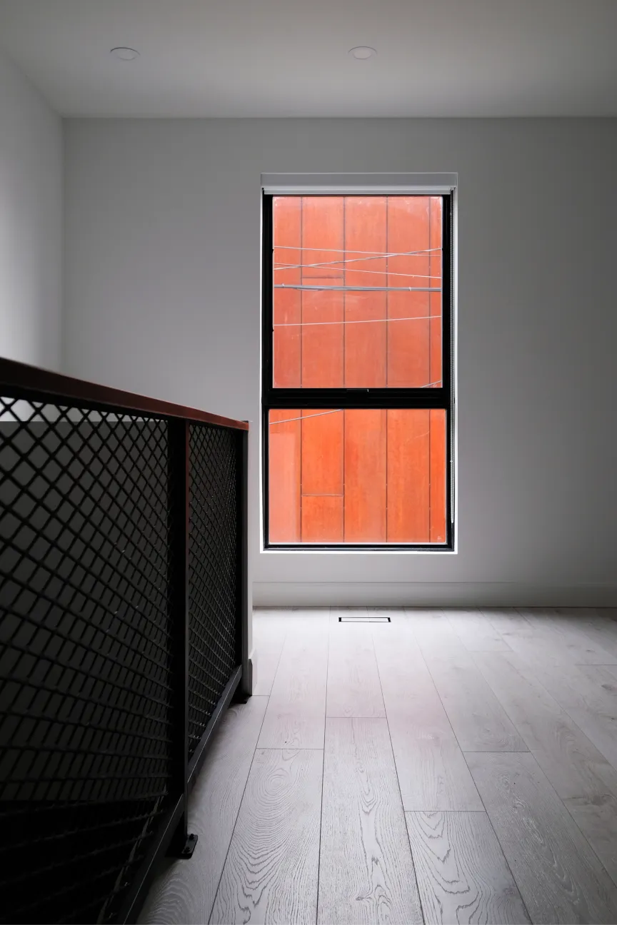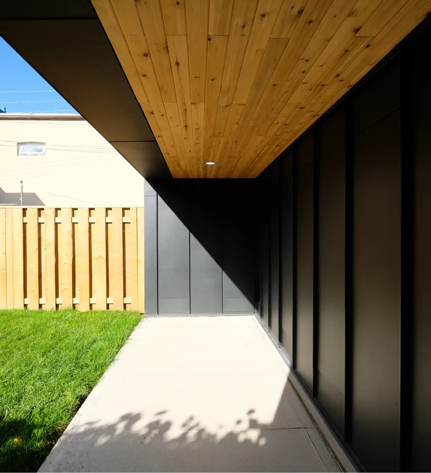Here, the ground floor serves as the garage for the homeowners, while the second floor contains a rental suite with all the amenities of a condo unit. The house is clad in a combination of painted brick and metal. Foundations were kept very light which facilitated a fast and cost effective construction.