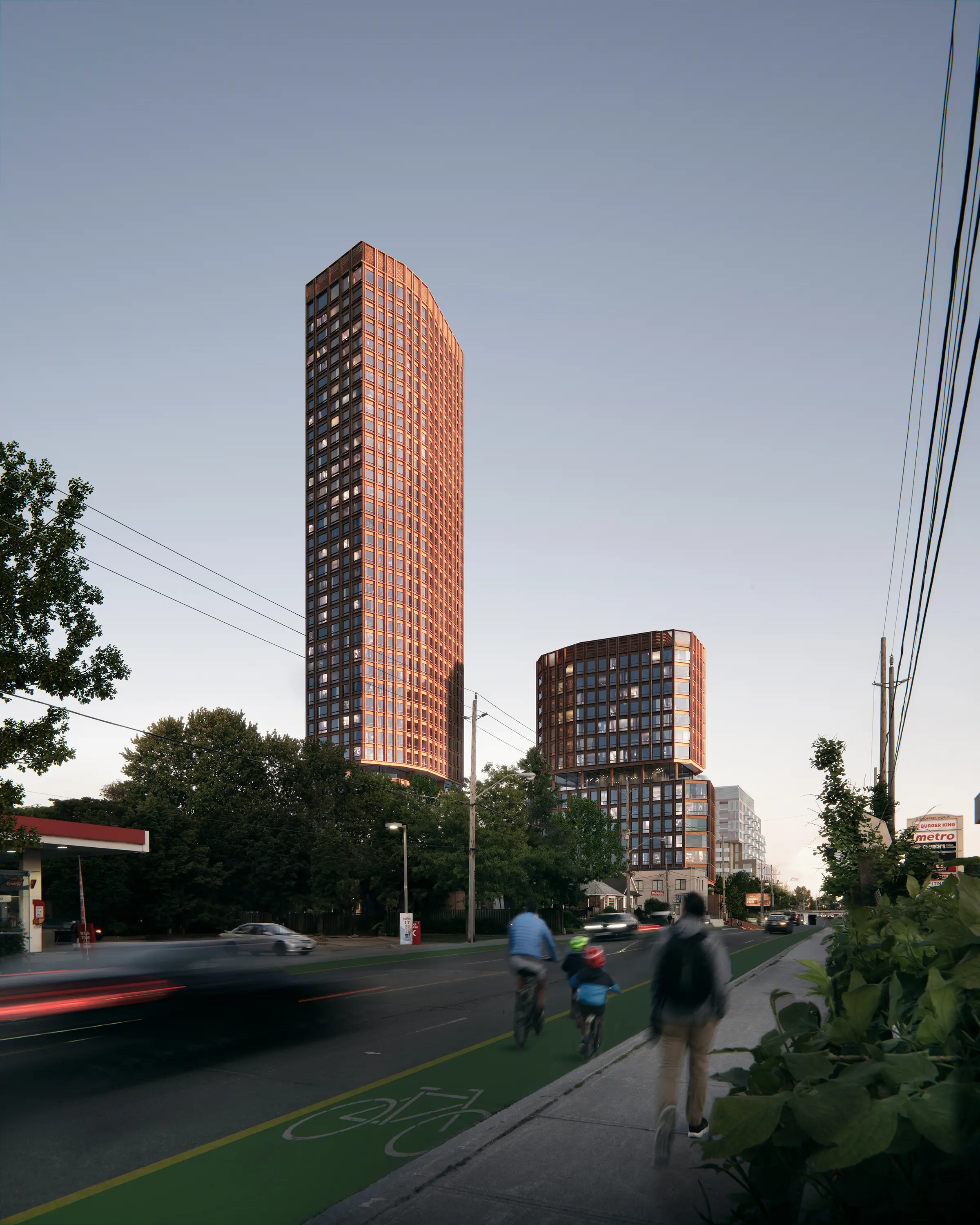 507-513 Victoria Park will introduce two striking towers, transforming a quiet block in Toronto’s East York neighbourhood. This two-tower mixed-use project, proposed by Sigma Group, will deliver housing, a school, a daycare, retail space, and a public park. The exciting new development revitalizes an underutilized site currently occupied by low-rise residential and commercial buildings and surface parking lots. Designed by Gabriel Fain Architects, the two residential towers, standing 39 and 16 storeys, will rise from a shared 8-storey L-shaped podium.