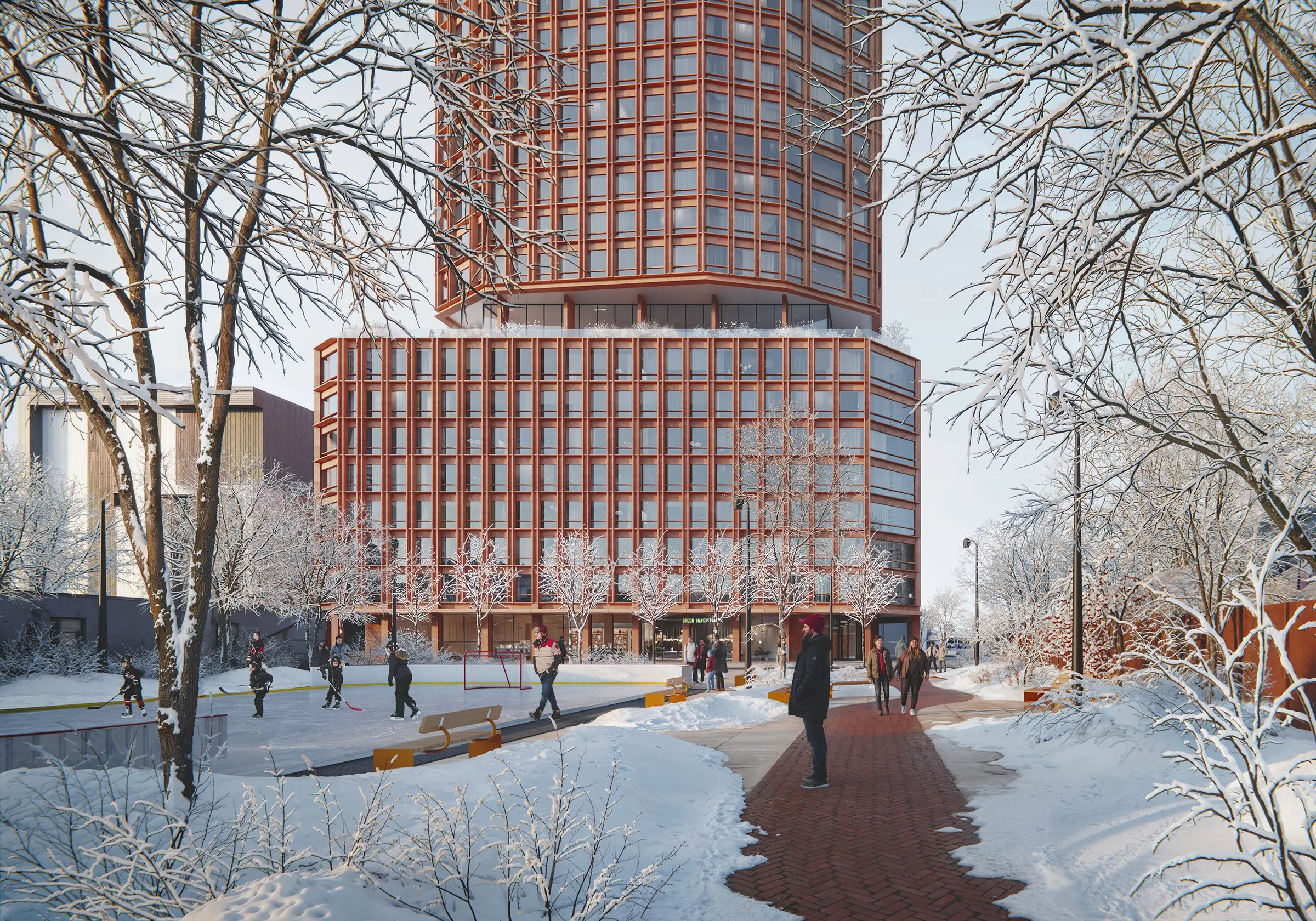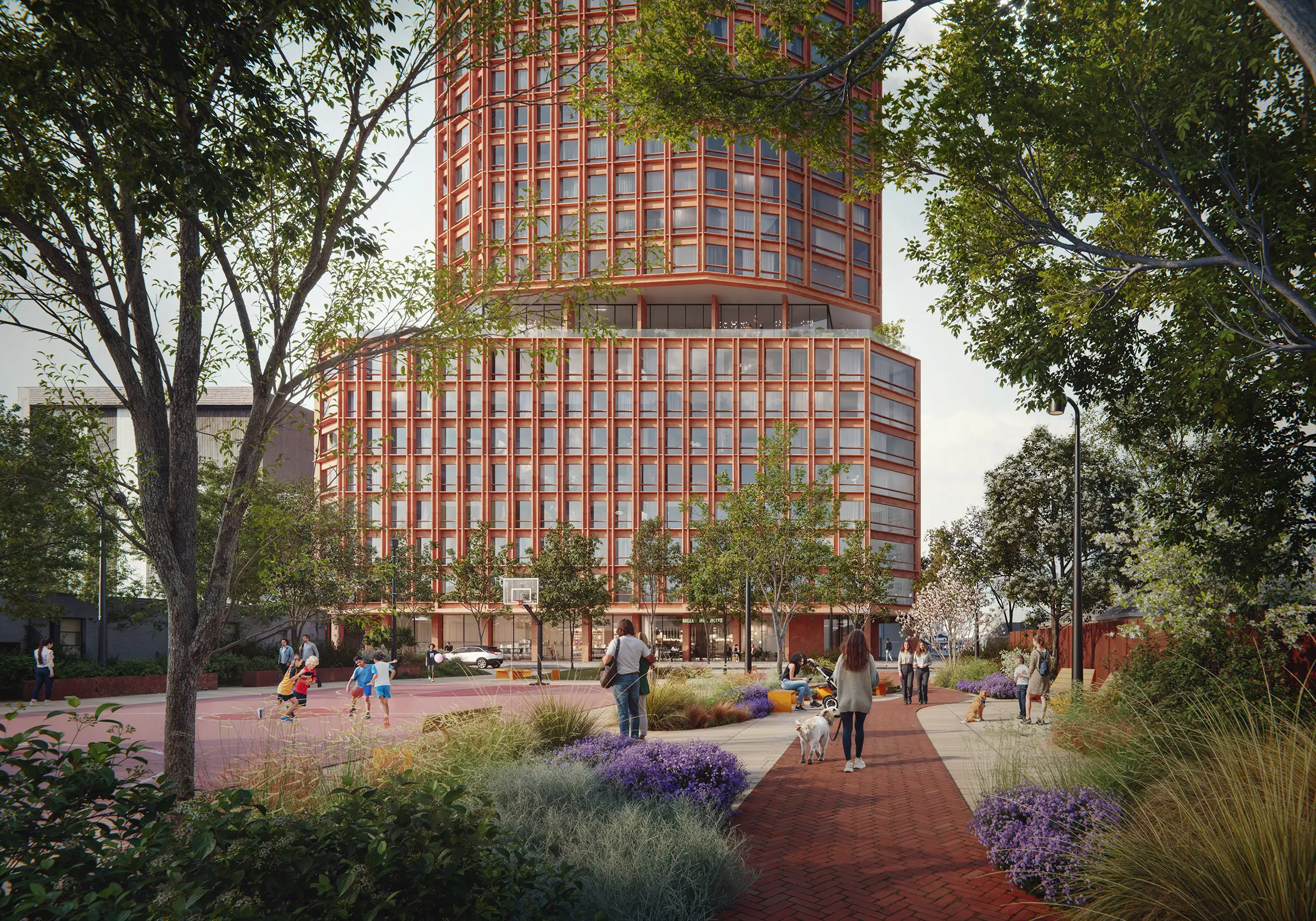 The towers feature a striking red brick and glass exterior, drawing inspiration from Toronto’s historic warehouses and blending them with contemporary materials. The majority of the floor area will be dedicated to residential space, with 578 units across approximately 470,103 sq. ft. The development focuses on larger residential units to accommodate families, with 46.5% of units dedicated to two- and three-bedroom units. There will be 309 one-bedroom, 210 two-bedroom, and 59 three-bedroom apartments. The towers offer 11,948 sq. ft. of indoor and 13,282 sq. ft. of outdoor amenities across floors two and nine, including an extensive terrace on the roof of the podium. Tenants will have access to two levels of underground parking containing 122 vehicle parking spaces and 638 bike parking spaces. At ground level, there will be 4,434 sq. ft. of retail space and 1,603 sq. ft. for a daycare with an outdoor play area.